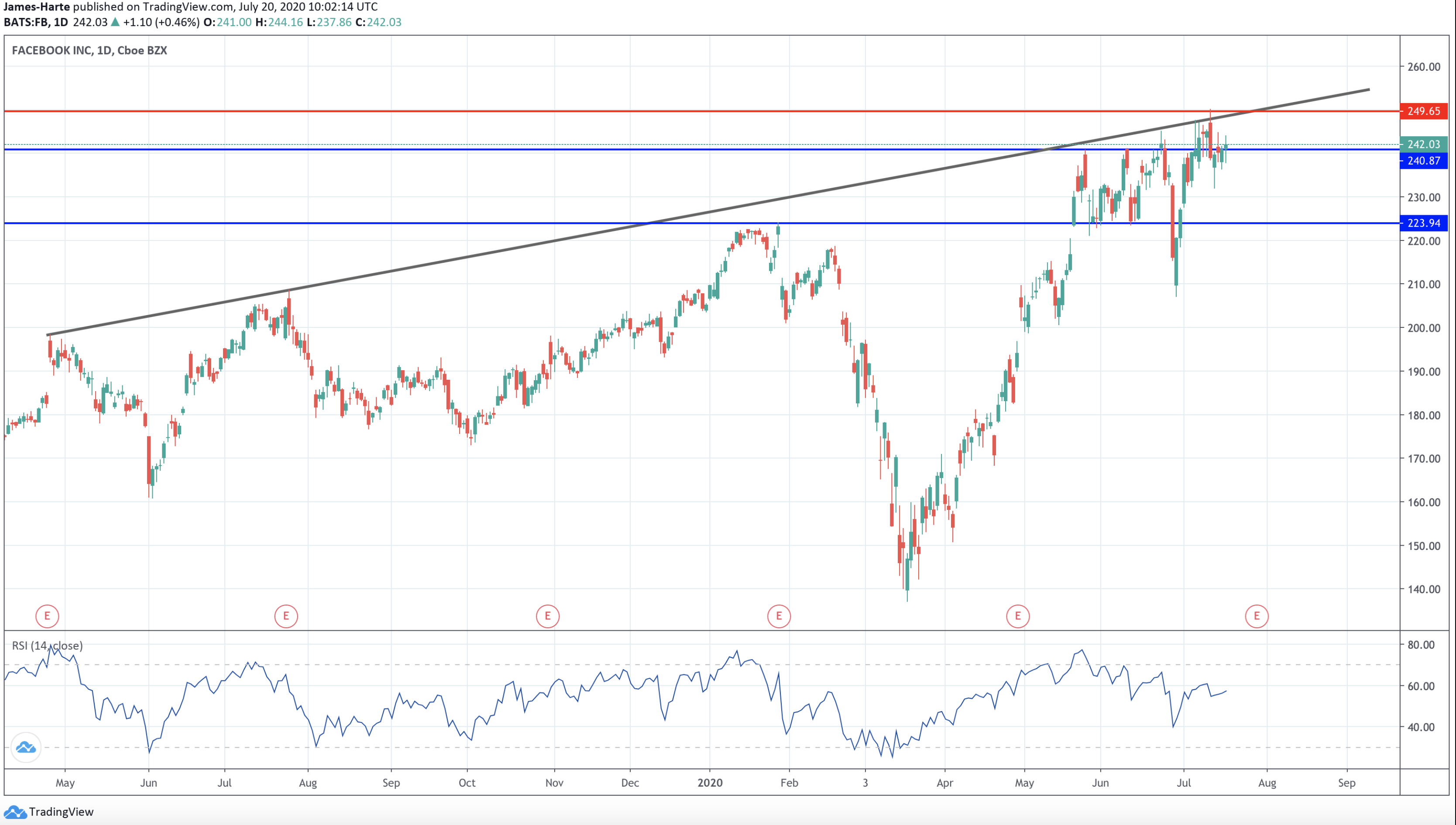وضعت مقاومة خط الاتجاه الصاعد من أعلى مستويات منتصف ٢٠١٩ حداً لارتفاعات فيسبوك، ليسجل بذلك أعلى مستوياته على الإطلاق عند ٢٤٩.٦٥. ورغم انخفاض السعر إلى ما دون مستوى ٢٤٠.٩٧ لفترة وجيزة، فقد تعافت الأسعار منذ ذلك الحين. وبينما يبقى السعر أعلى هذا المستوى، ينصب التركيز على المزيد من الارتفاع.