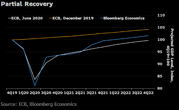 يبدو أن مسار الاقتصاد الذي توخاه مجلس الإدارة بالمركزي الأوروبي في يونيو، وهو قاع عميق في الربع الثاني يليه انتعاش سريع في الربع الثالث بدأ في الظهور.