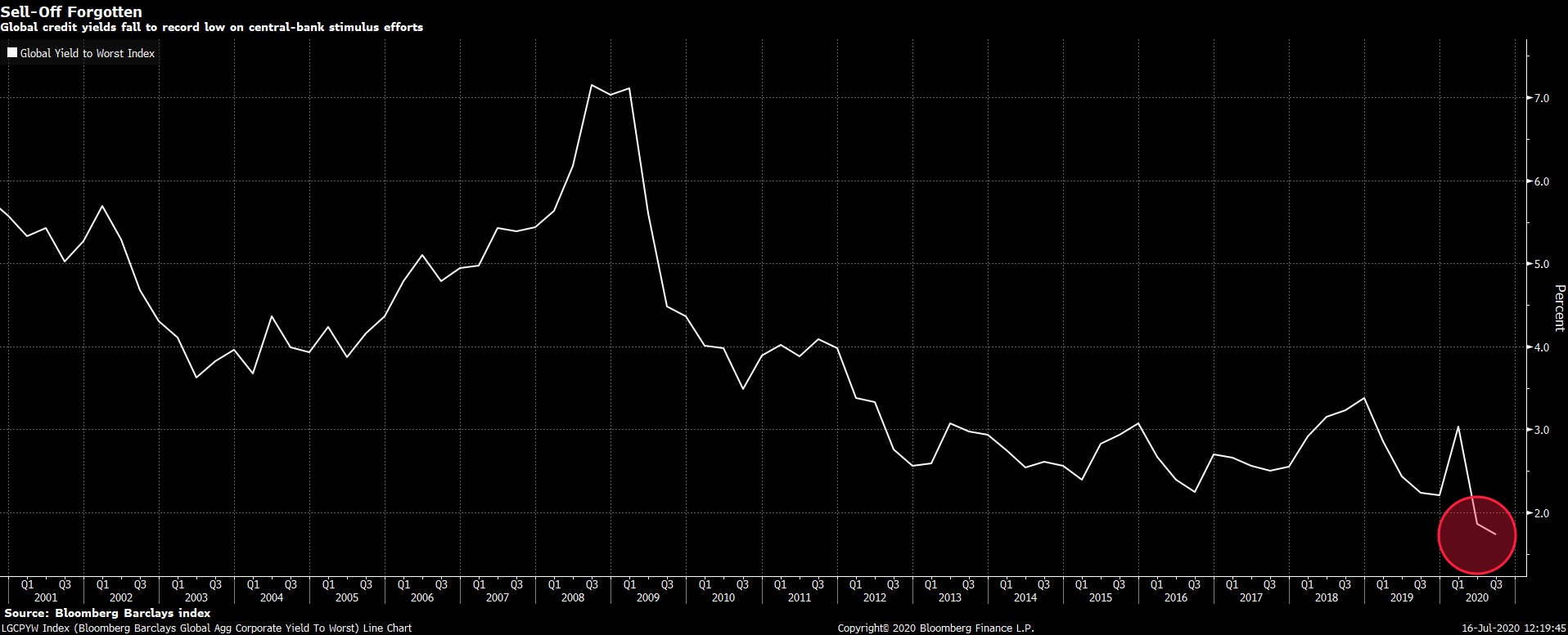 تراجعت عائدات السندات إلى 1.73٪ بعد أن بلغت ذروتها عند أعلى مستوى لها في ثماني سنوات 3.69٪ خلال أسوأ الاضطرابات من وباء كورونا في مارس، وهذا وفقاً لمؤشر بلومبرج باركليز منذ عقدين تقريباً.