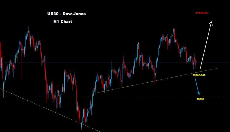 كما نرى على الرسم البياني، فإن مؤشر الداو يقترب من حواجز الدعم للاتجاه الصاعد حول مناطق 800-25700 والتي طالما السوق متماسك فوقها فإن ارتفاع جديد نحو مناطق 200-27000 قد يضرب السوق