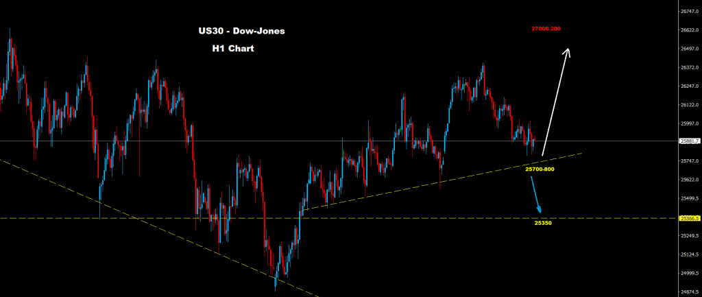 مؤشر الداو نجح بالتوجه لارتفاع جديد بعد أن أتم اختبار مناطق 800-25700 والتي طالما السوق متماسك فوقها فإن ارتفاع جديد نحو مناطق 200-27000 قد يضرب السوق