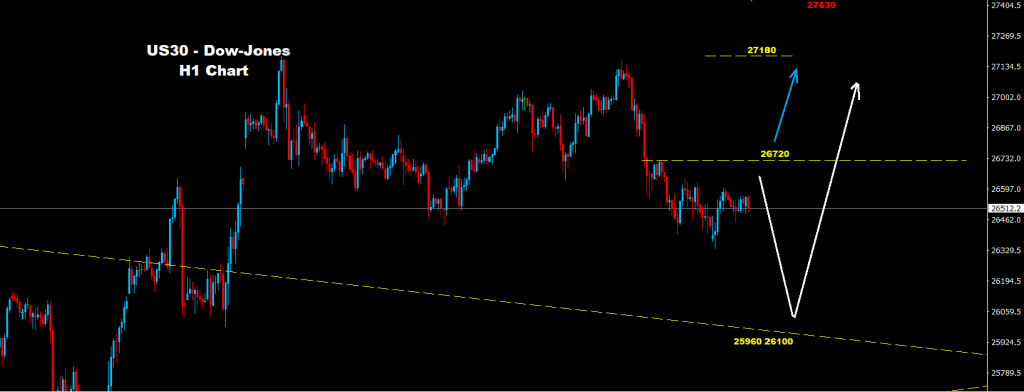 كما نرى على الرسم البياني وطالما السوق متماسك تحت حواجز مقاومة 26720 فإن التراجع والهبوط يتوقع أن يستمر لاختبار مناطق الدعم 26100-25960