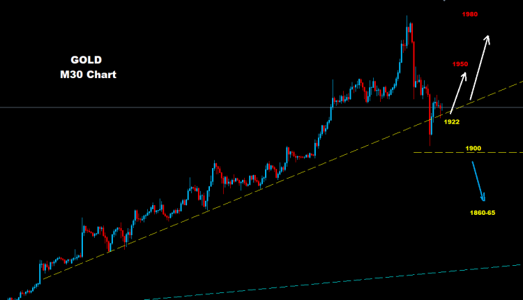 كما نرى على الرسم البياني فإن الذهب يواجه مستويات دعم على اسعار 1922 و 1900 والتي لا تزال تدعم السوق لمواصلة الصعود والتوجه مرة اخرى نحو مناطق 1950 و 1980