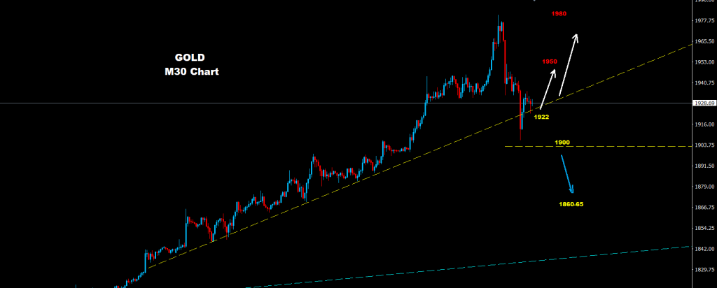كما نرى على الرسم البياني فإن الذهب يواجه مستويات دعم على اسعار 1922 و 1900 والتي لا تزال تدعم السوق لمواصلة الصعود والتوجه مرة اخرى نحو مناطق 1950 و 1980