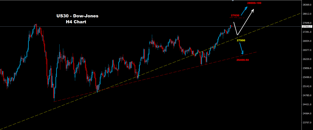نجح مؤشر الداو باختبار مناطق الدعم 26100-25960 والتي نجحت بالدفع بموجة صعود نحو أهداف 27180 و اختراقها