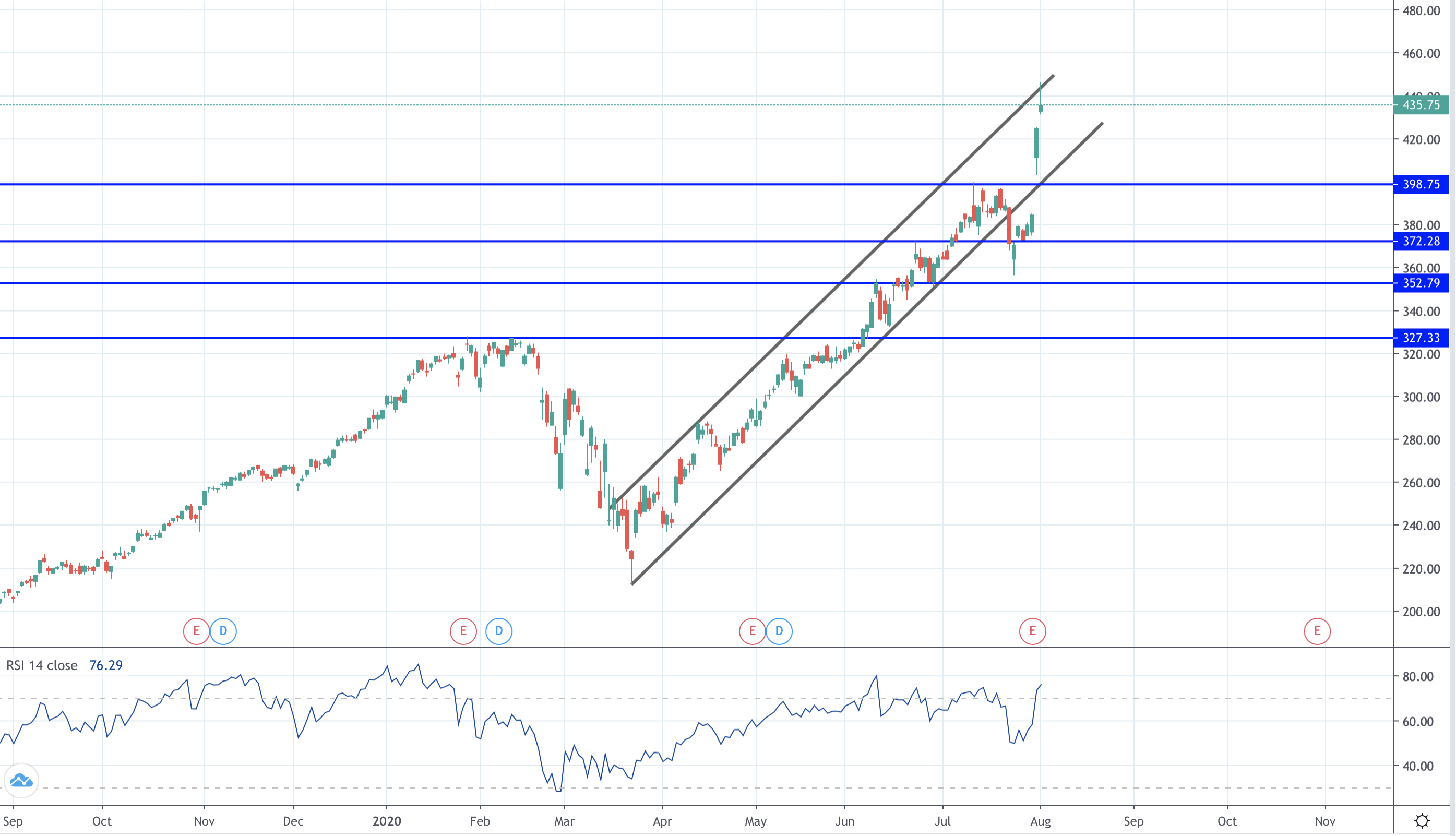 تتداول آبل أدنى أعلى المستويات القياسية الأخيرة بقليل، بعد أن وجدت مقاومة عند قمة القناة الصاعدة. ويمتد السعر هنا بعد الفجوة الإيجابية في استجابة لتقرير الأرباح. وفي حين أن حدوث بعض التراجع يعد محتمل، يبقى التركيز منصب على استمرار الاتجاه الصاعد طالما يستقر السعر فوق مستوى ٣٩٨.٧٥.