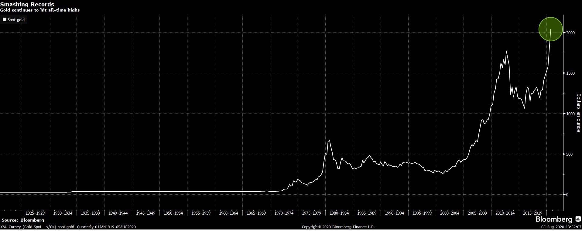 ارتفع الذهب إلى مستوى قياسي جديد ليتجاوز مستوى 2044 دولار للأونصة، وهذا ما توقعناه على المدى الطويل منذ أبريل الماضي كما ذكرنا في مقالتنا “أهداف الذهب كبيرة! فهل يحقق المركز الأول بين المعادن الثمينة في 2020؟“.