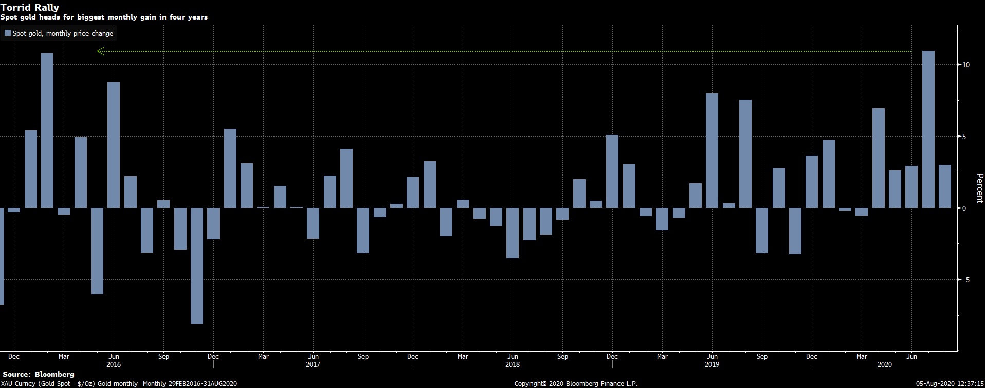 ارتفع الذهب بأكثر من 10٪ في يوليو متجهاً إلى أفضل شهر له منذ عام 2016 حيث بقيت العوائد الحقيقية للولايات المتحدة بالقرب من أدنى مستوياتها القياسية.