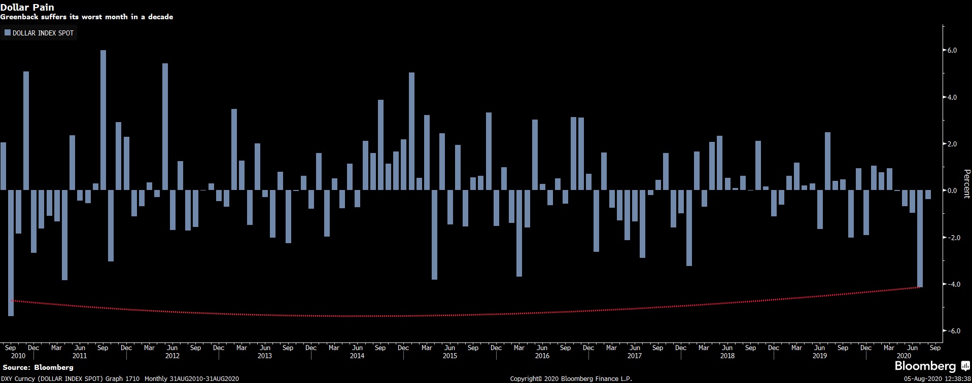 استمر الدولار الأمريكي بالتراجع مع بداية جلسات أغسطس بعد أن سجل مؤشر الدولار مقابل نظرائه انخفاضاً بنسبة 4.4٪ في يوليو، وهو أسوأ هزيمة منذ عقد من الزمن.