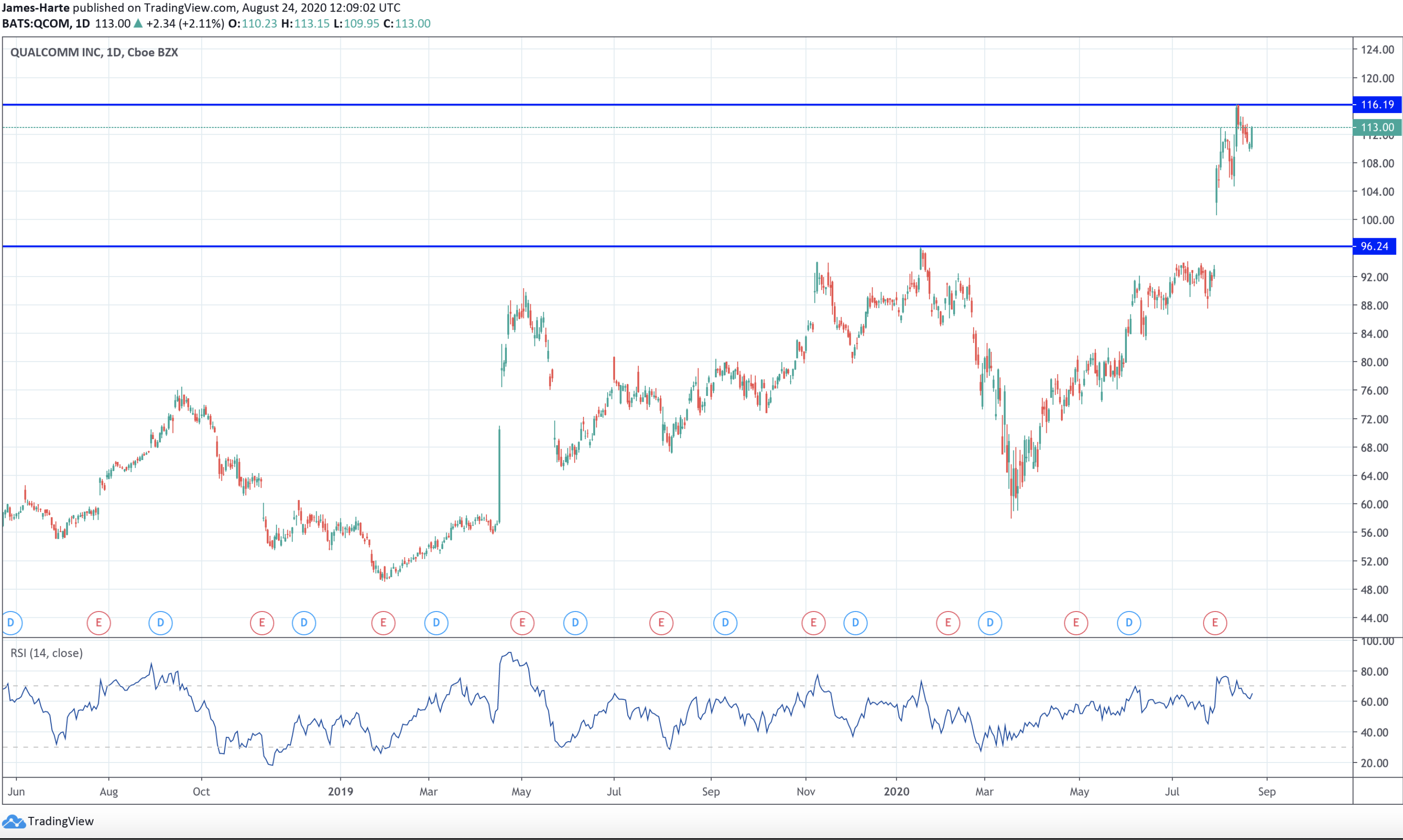 ارتفعت الأسهم في كوالكوم بقوة خلال الأسابيع الأخيرة على خلفية تقرير أرباح قوي للربع الثاني. لقد اخترقت الأسهم فوق المستوى 96.24، وعلى الرغم من التصحيح إلى حد ما من أعلى المستويات الأخيرة في 116.19، إلا أن التحيز على المدى القريب لا يزال صاعداً بثبات. بينما إذا استقر السعر فوق مستوى 96.24 يظل التركيز على الاتجاه الصاعد مستمراً في المدى القريب.