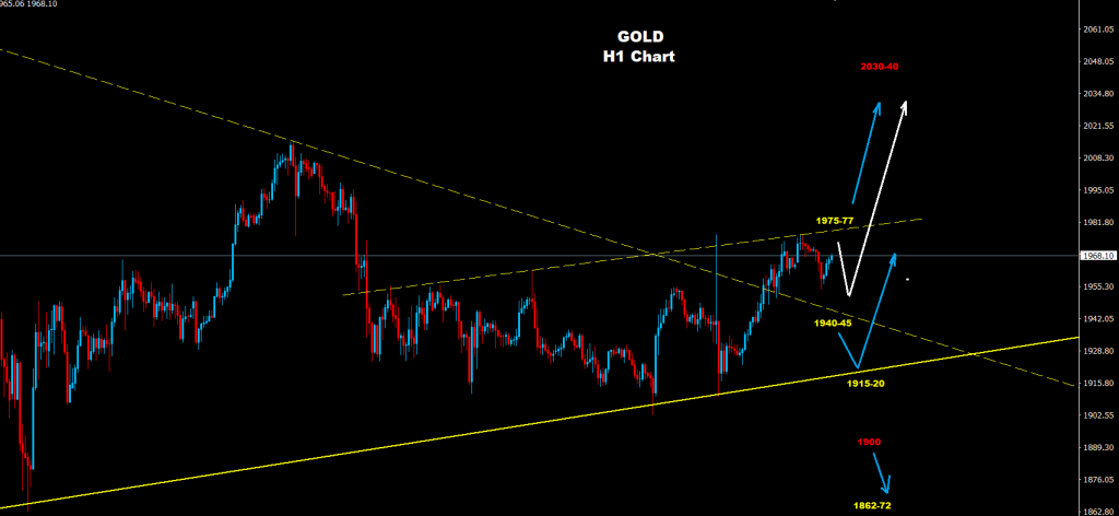 كما نرى على الرسم البياني فإن الذهب يمتلك مناطق دعم على مستويات 1954 و مناطق 45-1940 والتي إحداها قد تدعم مزيد من الصعود لاختراق حواجز المقاومة لمناطق 77-1975