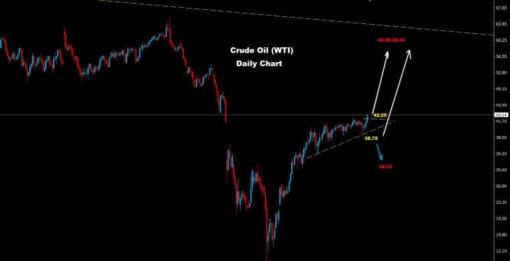 نجح النفط الخام باختراق صريح لحواجز مقاومة 42.25 والتي يبدو أن السوق يتجه لبناء موجة صعود جديدة بالسوق