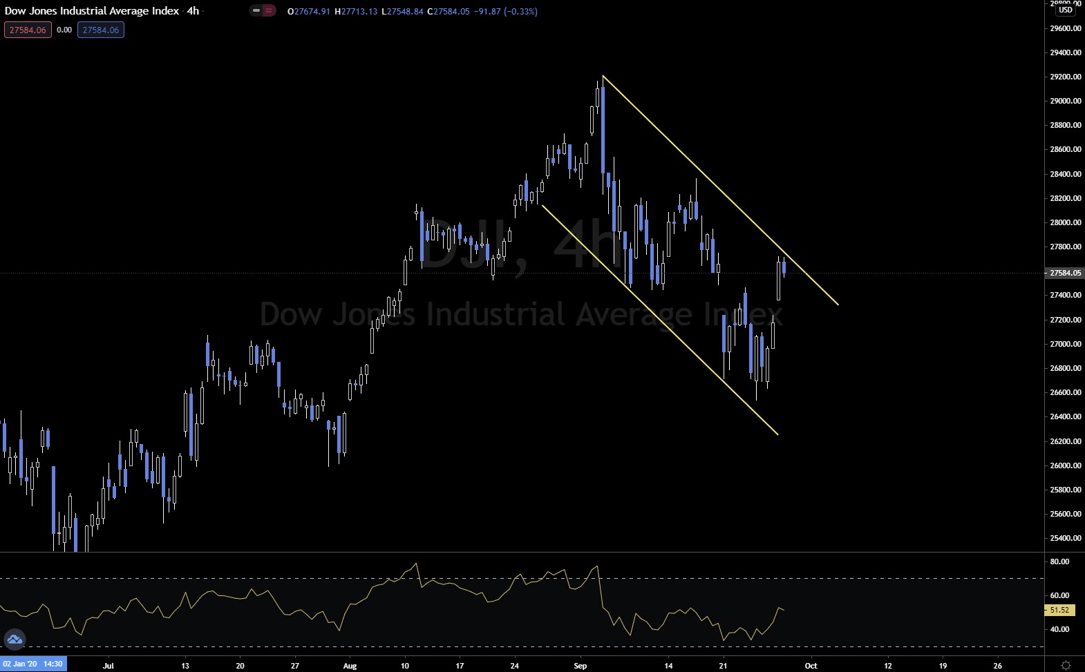 من الناحية الفنية، يلاحظ استقرار تداولات مؤشر الداو داخل قناة سعرية هابطة على الإطار الزمني 4 ساعات ومن المتوقع أن يسجل المزيد من الارتفاع في حال اختراق الحد العلوي للقناة والمستوى 27,800 لاستهداف المستوى 28,350.