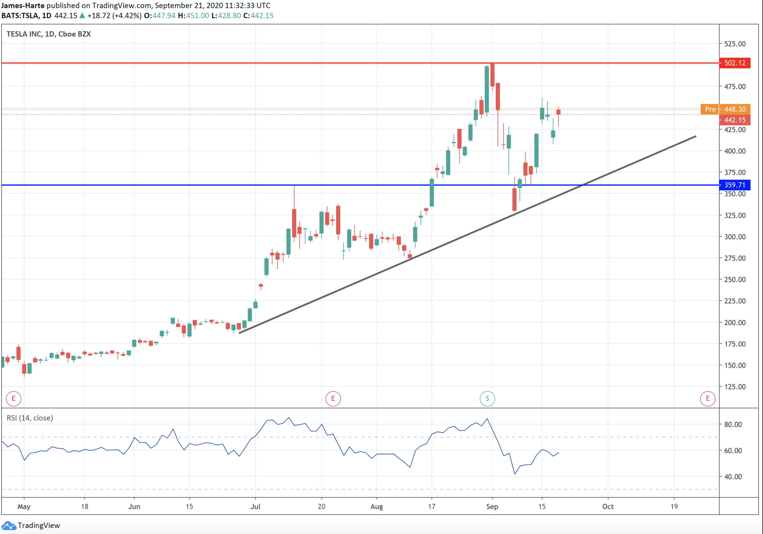 بعد التحرك الهبوطي من أعلى مستوياته في أغسطس، وجدت أسهم تيسلا الدعم في اختبار خط الاتجاه الصعودي من أدنى مستويات عام 2020 ودعم المستوى 359.71.