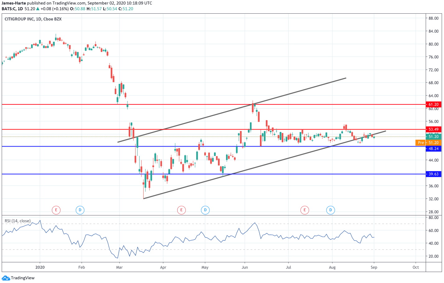 شهدت الأسهم في “سيتي بنك” ثباتاً خلال الأشهر الأخيرة. ولا يزال السعر عالقاً بين مستوى الدعم ٤٨.٢٤ والمقاومة عند منطقة ٥٣.٤٩. وقد اخترق السعر مؤخراً ما دون قاع القناة الصاعدة.