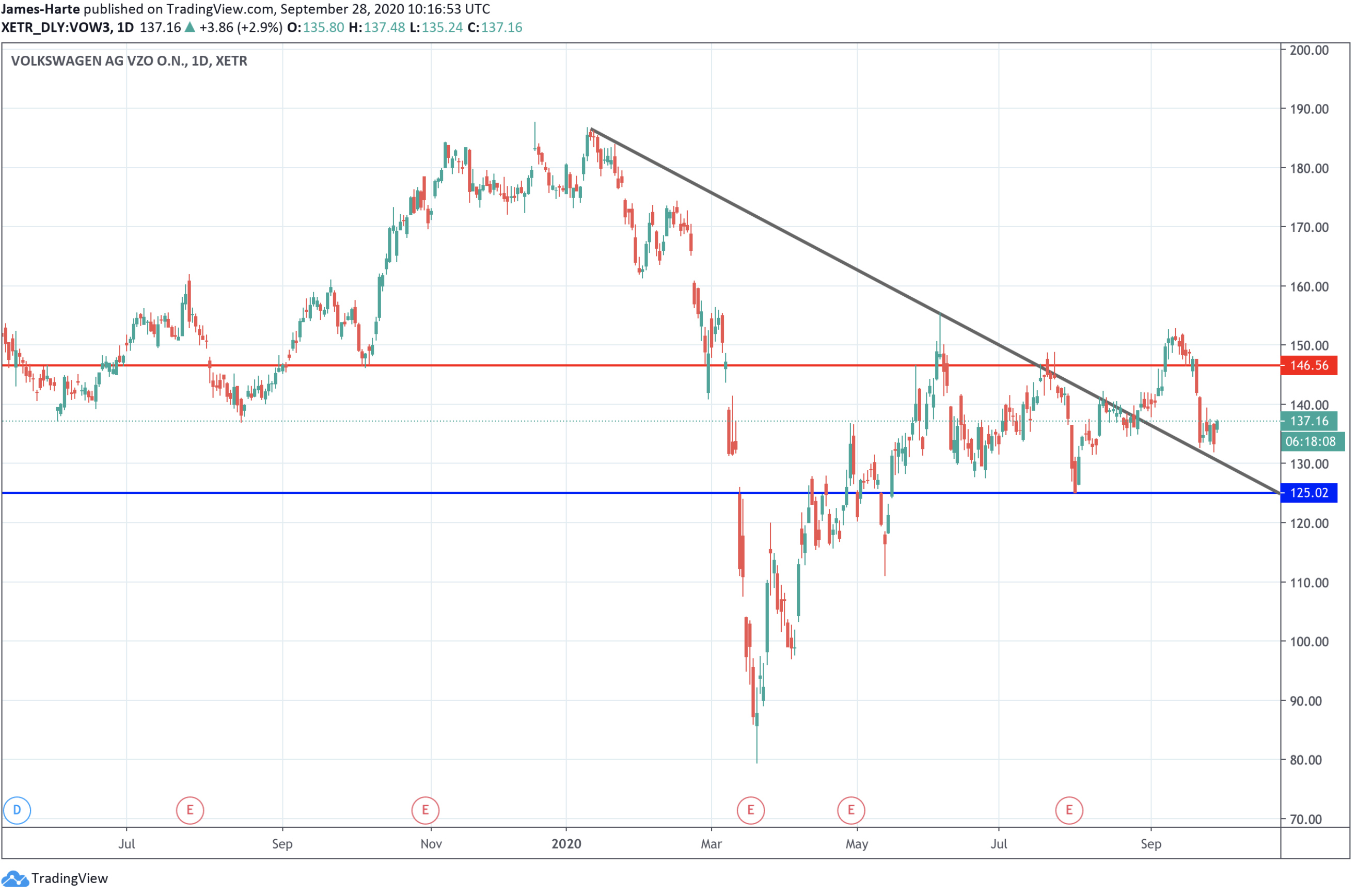 بعد تجاوزها لخط الاتجاه الهابط من أعلى مستويات عام٢٠٢٠، فشلت أسهم “فولكس فاجن” مرة أخرى في الثبات أعلى مستوى المقاومة ١٤٦.٥٦. لترتد للأسفل بعد ذلك. ويقوم السعر الآن بإعادة اختبار خط الاتجاه المخترق، والذي يثبت كدعم.