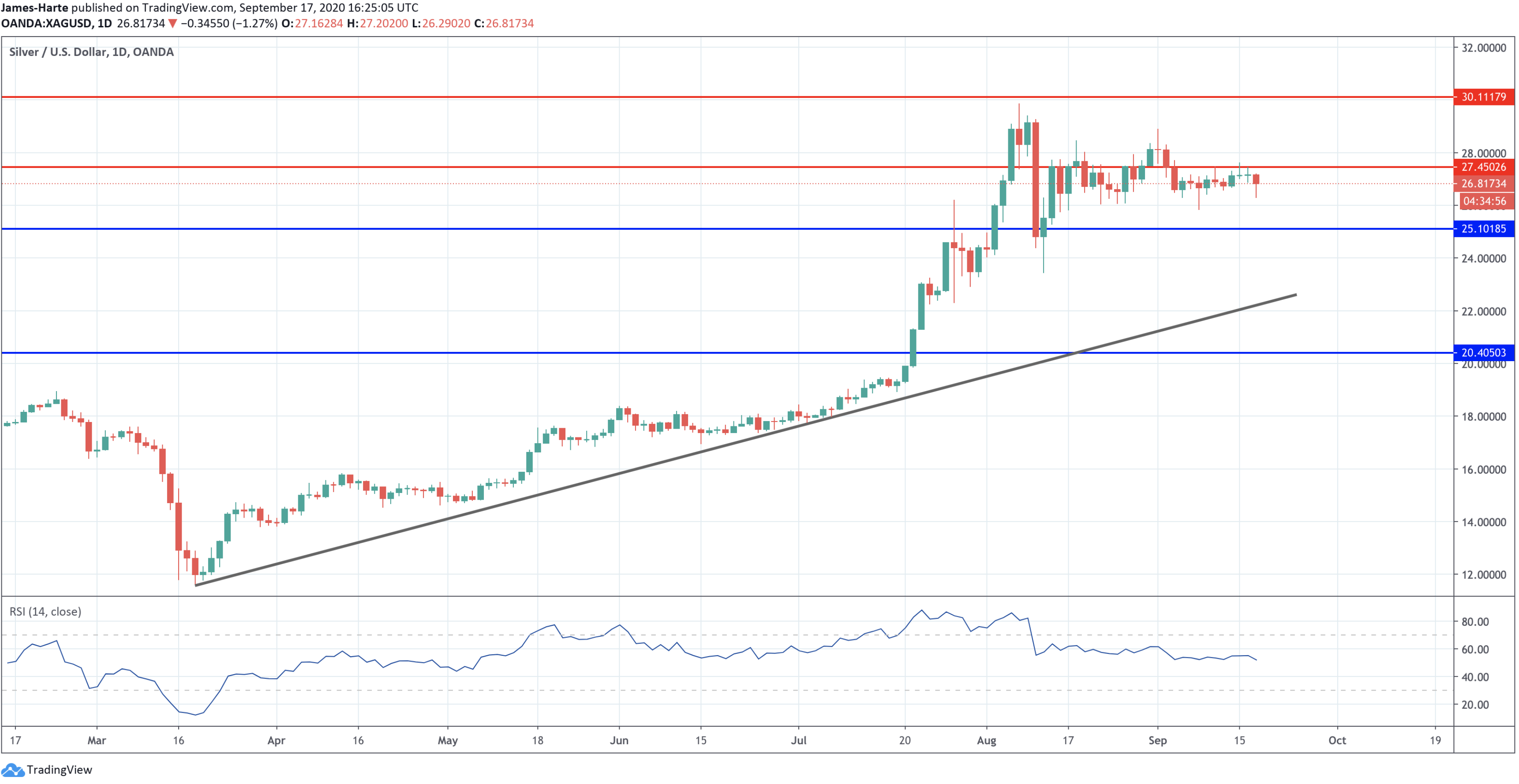 تواصل أسعار الفضة الحركة حول المستوى ٢٧.٤٥٠٢ والذي عمل كمقاومة من جديد هذا الأسبوع.