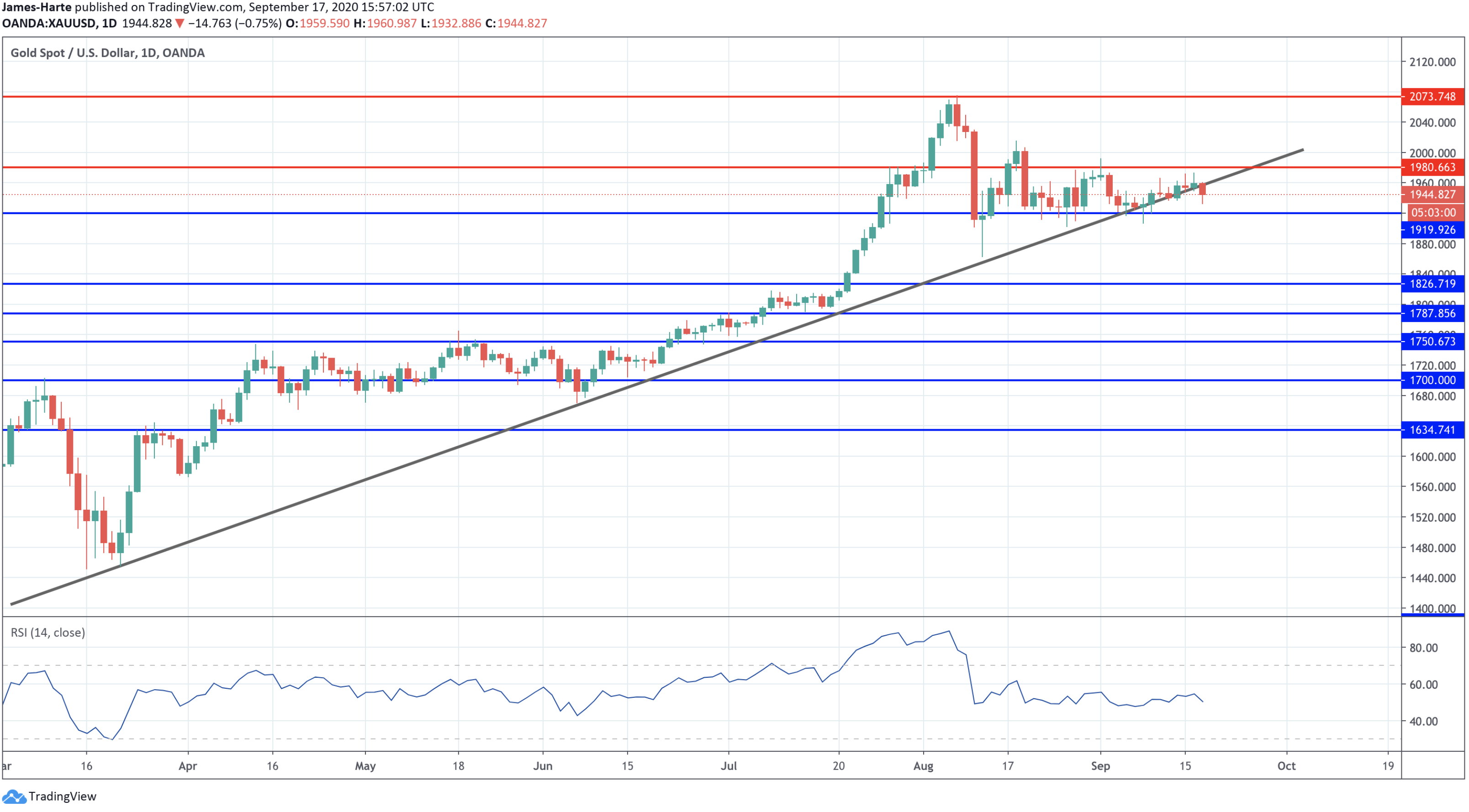 تواصل أسعار الذهب اختبار خط الاتجاه الصاعد من أدنى مستويات عام ٢٠٢٠ ولا تزال الأسعار تحوم قرب خط الاتجاه حتى وقت كتابة هذا التقرير.