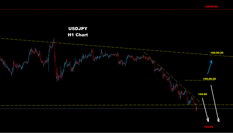 كما نرى على الرسم البياني فإن السوق يواجه مستويات مقاومة على مناطق 104.60 و 20-105.00 والتي طالما يحافظ على تداولاته تحت إحدى تلك المستويات فإن مزيد من التراجع والهبوط نحو مناطق 103.00 سيكون متوقع
