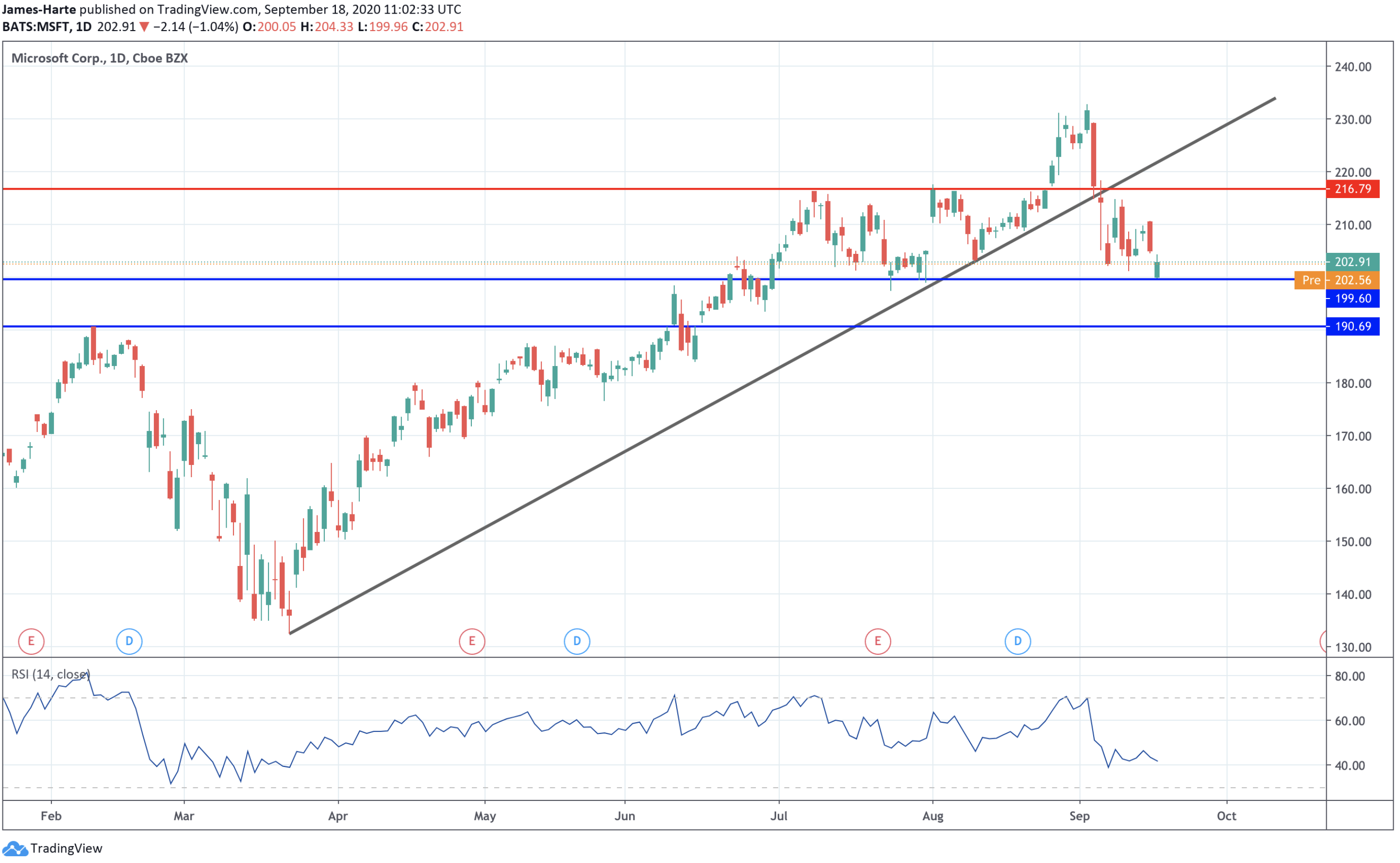 تجاوزت أسهم مايكروسوفت مؤخراً خط الاتجاه الصاعد من أدنى مستويات عام ٢٠٢٠ وتختبر الآن الدعم عند مستوى ١٩٩.٦٠. وإذا اخترق السعر إلى ما دون ذلك المستوى التالي فيجب مراقبة مستوى الدعم التالي ١٩٠.٦٩. ولكن إذا تمكن المشترون من الدفاع عن المستوى، فمن المحتمل أن نرى عودة للأعلى نحو المستوى ٢١٦.٧٩ والذي لا يزال مستوى المقاومة الرئيسية الذي يجب الانتباه له.