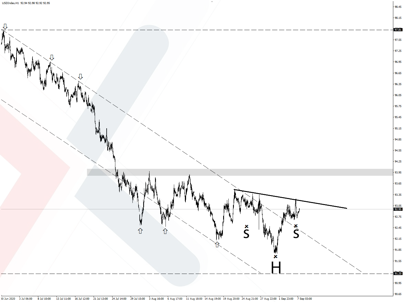 أيضاً يتضح تكون نموذج رأس وكتفيين يتفق مع المناطق السابق ذكرها مناطق المقاومة واختراقها ربما يدعم مزيد من الأرتفاع إلى مستويات 94.00 نقطة ومستويات الـ 95.00