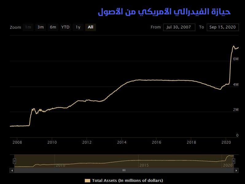 يوضح الرسم البياني التالي ارتفاع موازنة الفيدرالي من 870 مليار دولار إلى 4.5 تريليون دولار خلال الفترة ما بين الأزمة المالية العالمية في 2008 حتى عام 2015 ثم بدأ الفيدرالي في تخفيضها خلال الفترة ما بين أكتوبر 2017 حتى أغسطس 2019 لتصل إلى 3.8 تريليون دولار ولكنها بدأت في الزيادة بقوة بداية من سبتمبر 2019 مروراً بأزمة كورونا لتصل حالياً إلى 7 تريليون دولار ما يمثل 36% من الناتج المحلي الإجمالي على عكس المركزي الأوروبي الذي وصلت موازنته إلى 6 تريليون يورو لأول مرة على الإطلاق بما يمثل 63% من الناتج المحلي وسجلت زيادة قدرها 28 مليار دولار وهي الأعلى منذ يوليو الماضي، وهو ما يفسر ارتفاع الدولار الأمريكي أمام اليورو خلال الأسبوع الحالي.