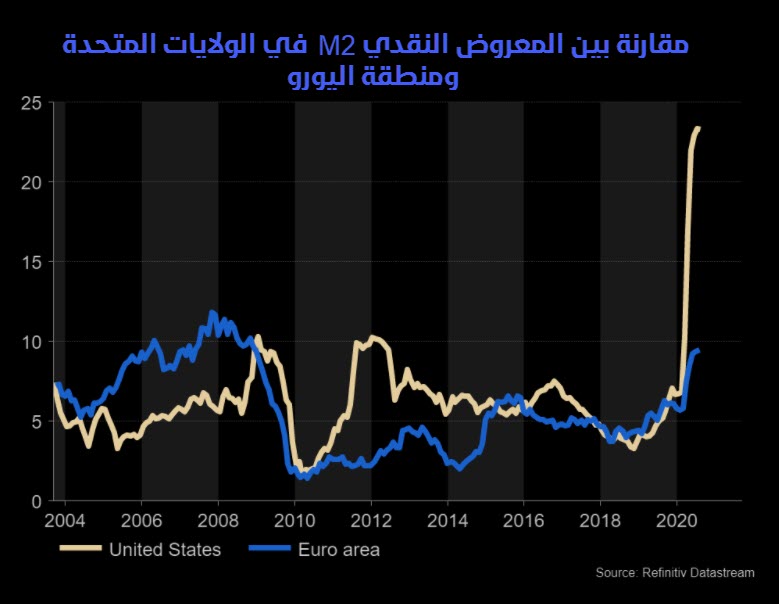 والجدير بالذكر أن معدل ضخ السيولة النقدية قد تخطى نظيره في منطقة اليورو بكثير مما قد يضع المزيد من الضغوط على الدولار أمام اليورو على المدى المتوسط والطويل.