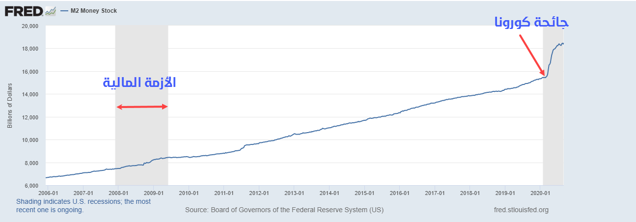 اللافت للانتباه أن حجم المعروض النقدي داخل الولايات المتحدة M2 قد شهد تسارع قوي جداً خاصة في العام الجاري كما هو موضح على الرسم البياني التالي