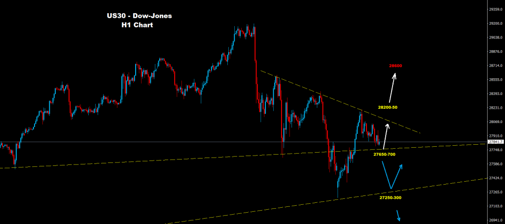 تحت مستويات 27650 فإن مزيد من التراجع والهبوط سيكون متوقع لاختبار مناطق 300-27250 والتي بدورها قد تدفع بارتفاع جديد بالسوق