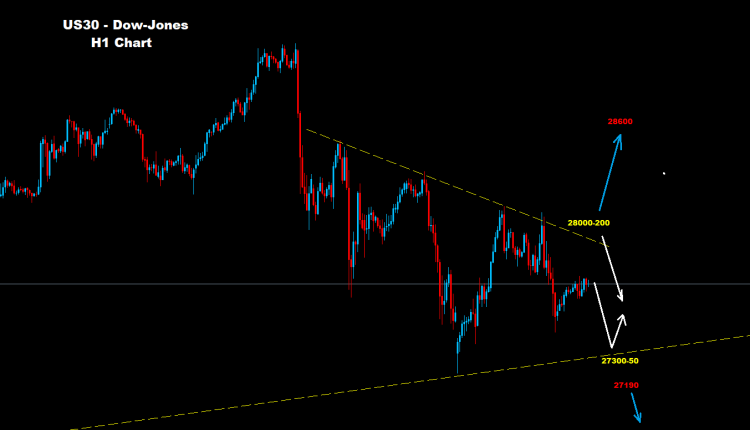 فشل مؤشر الداو باختراق مستويات المقاومة 28200 يوم أمس حيث لا يزال السوق يواجه ضغوط الهبوط والتراجع لاختبار مناطق الدعم 50-27300