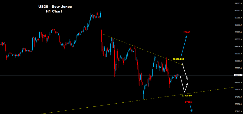 فشل مؤشر الداو باختراق مستويات المقاومة 28200 يوم أمس حيث لا يزال السوق يواجه ضغوط الهبوط والتراجع لاختبار مناطق الدعم 50-27300