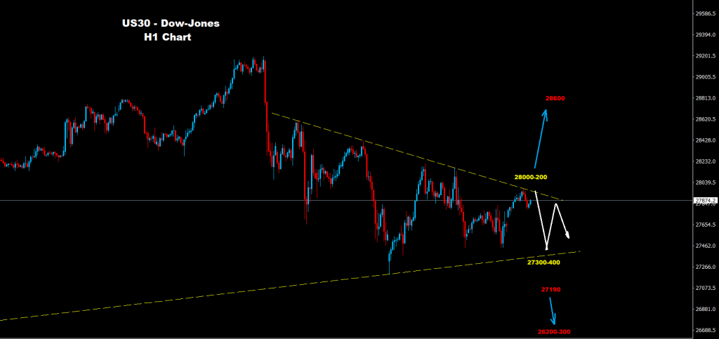 لا يزال مؤشر الداو يحافظ على تداولاته تحت مستويات المقاومة 200-28000 حيث وفي هذه الحاله فإن ضغوط الهبوط لا تزال تؤشر على السوق كما أشرنا له الأسبوع الماضي