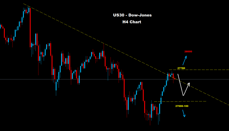 في حين بقاء التداول تحت مستويات 27780 سيدفع بحركة تصحيحية هابطة لاختبار مستويات 27290 او 100-27000