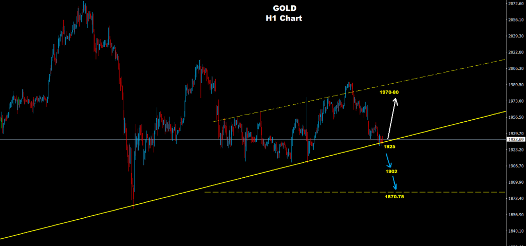 نجح المعدن الثمين بالتراجع والهبوط تحت مستويات 1955 حيث تمكن من اختبار مستويات الدعم للاتجاه الصاعد حول مناطق 1925