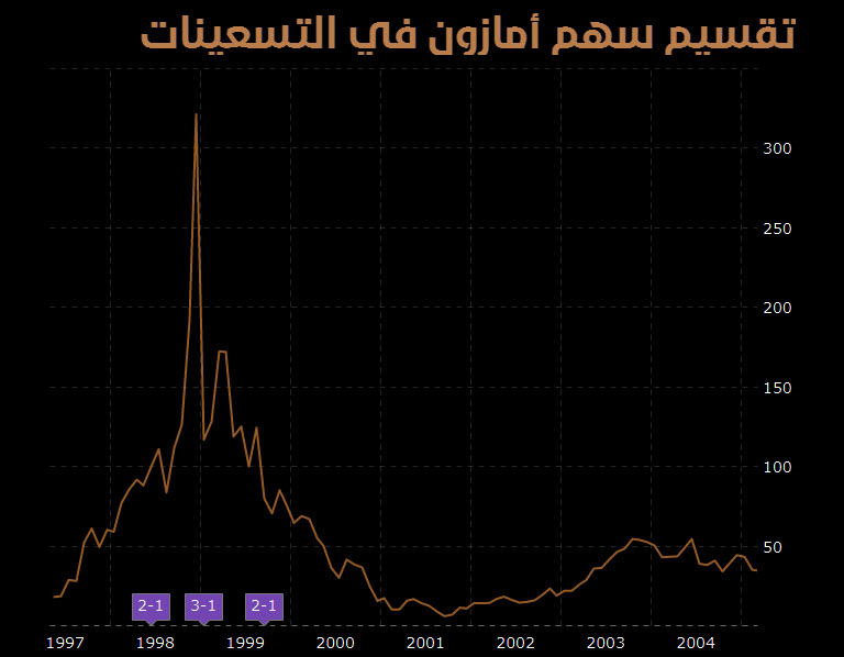 اللافت للانتباه أنه قد تم تقسيم سهم أمازون ثلاثة مرات في التسعينات، سهمين لكل سهم في فبراير 1998 وسهمين لكل سهم في فبراير 1999 ثلاثة أسهم لكل سهم في مايو 1999.