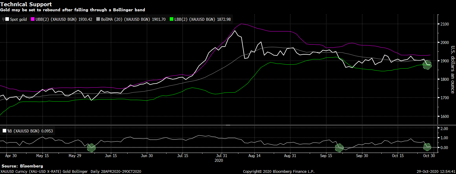 في حين أن الكثير سيعتمد على نتيجة الانتخابات الأمريكية الأسبوع المقبل وما سينتج عن استكمال لعمليات التحفيز المرتقبة مع تنامي الموجة الثانية من وباء كورونا، وهذا قد يكون عامل لانتعاش المعدن الثمين بالإضافة وفقاً لبعض المؤشرات الفنية.