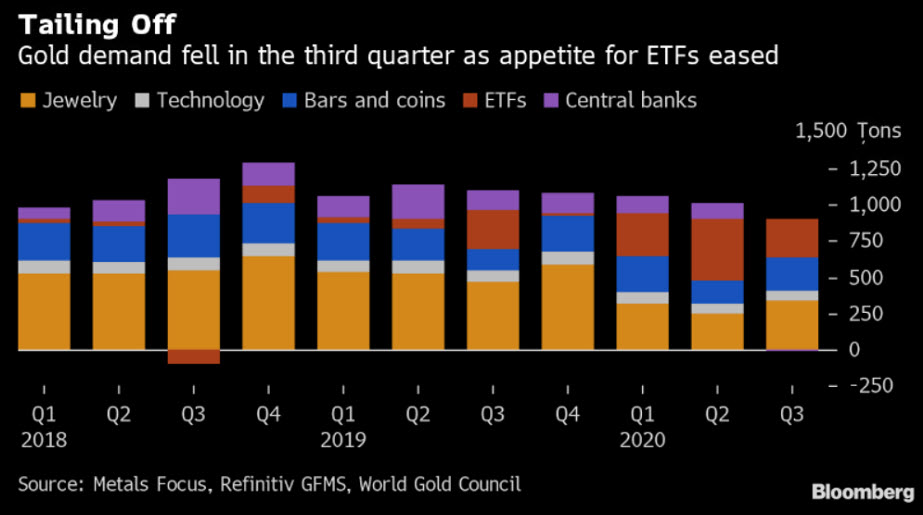 في حين أن التدفقات الداخلة إلى الصناديق المتداولة في البورصة دفعت تقدم الذهب في عام 2020، وساعد الشراء من قبل البنوك المركزية في دعم السبائك في السنوات الأخيرة.