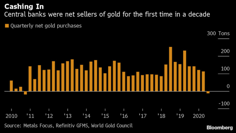 أتت تلك الضغوط أيضاً لتراجع الذهب هذا الأسبوع مع تقرير مبيعات البنوك المركزية، والتي أظهرت أن البنوك المركزية أصبحت من بائعي الذهب لأول مرة منذ عام 2010 حيث استغلت بعض الدول المنتجة الأسعار شبه القياسية لتخفيف وطأة جائحة فيروس كورونا.
