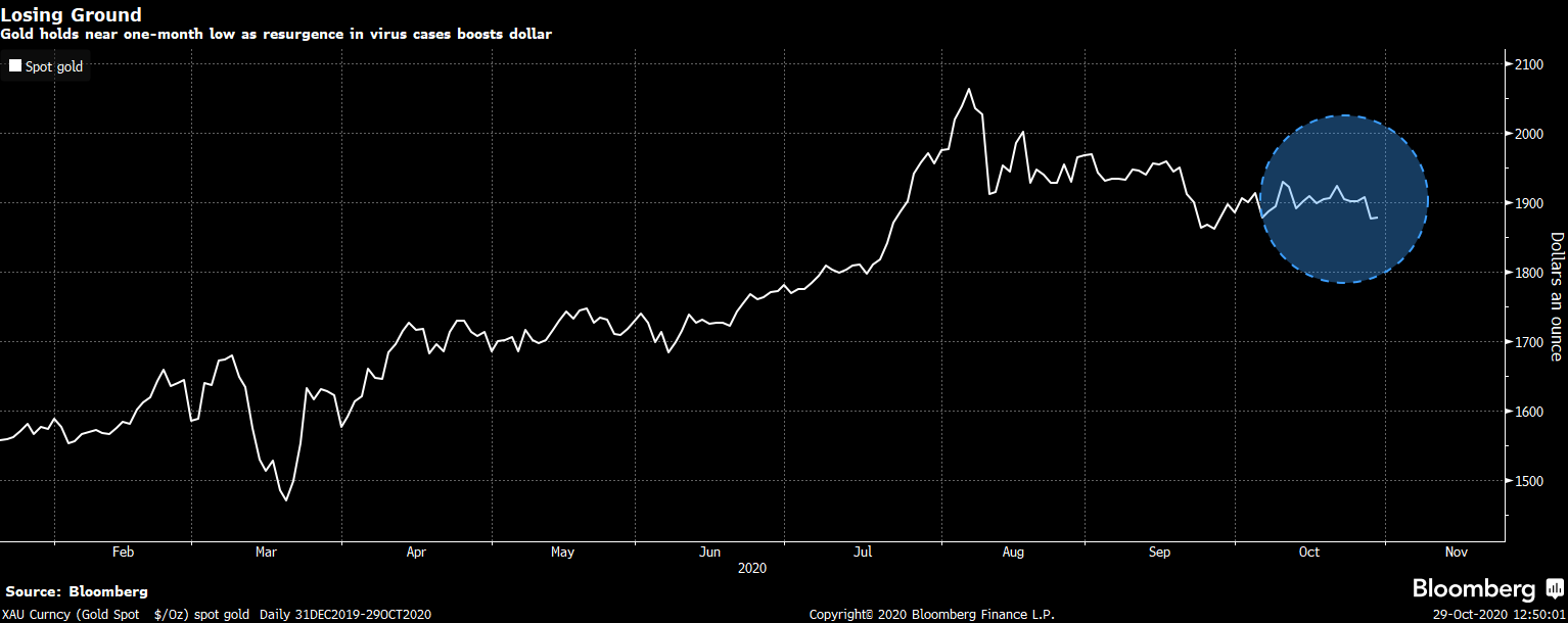 تعرض الذهب لضغوط مع ارتفاع عدد الإصابات بفيروس كورونا والقيود الأكثر صرامة في جميع أنحاء أوروبا إلى الدولار، وهبط 1.6% يوم الأربعاء إلى أدنى مستوى إغلاق منذ 25 سبتمبر