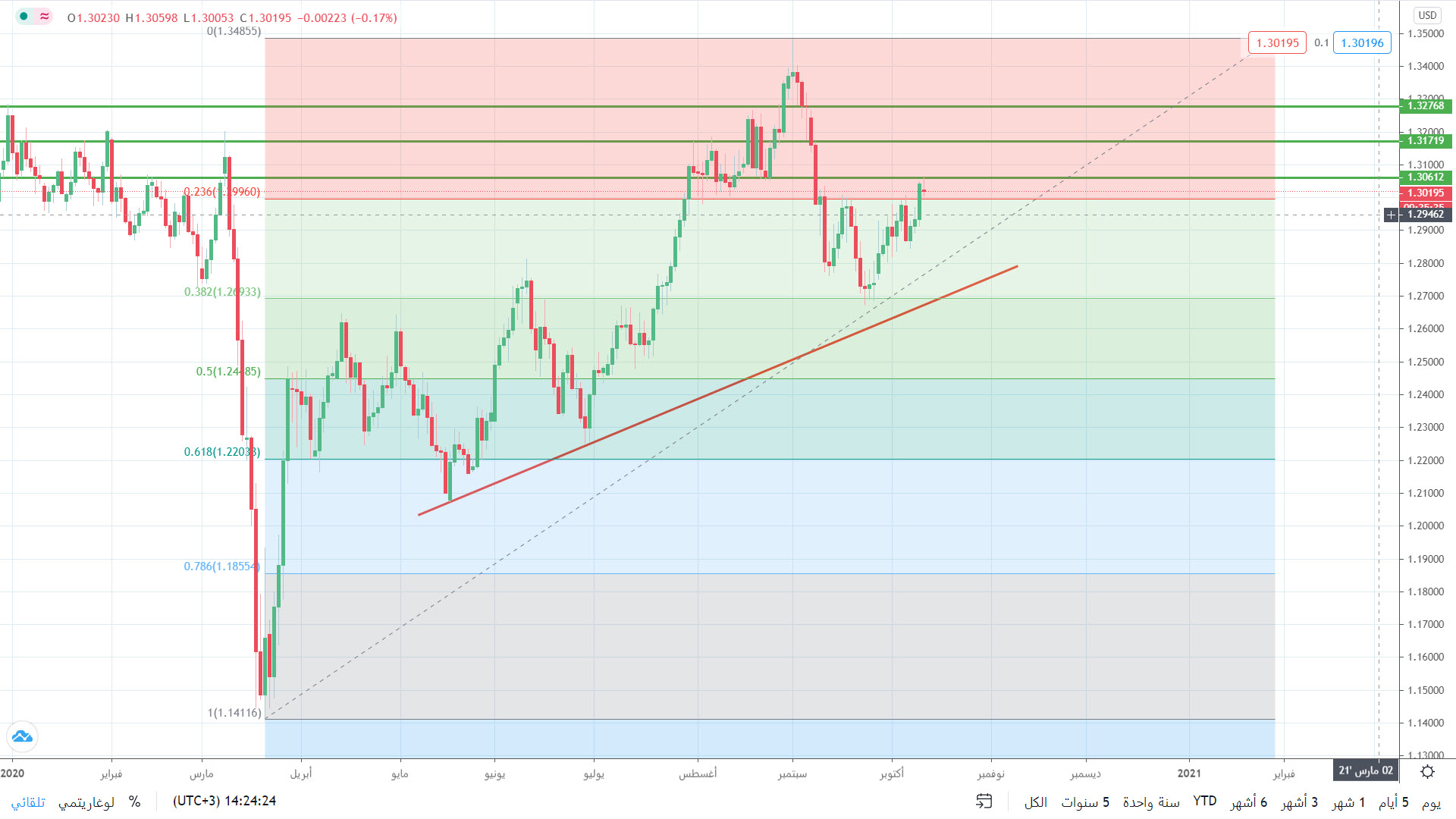 وباختراقها سيواجه مستوى المقاومة الثانية عند 1.3080 أما بالاستقرار أعلى هذا المستوى قد يعزز من استهداف المقاومة الأسبوعية والهامة عند مستوى 1.3170 قرب قمة 8 سبتمبر.