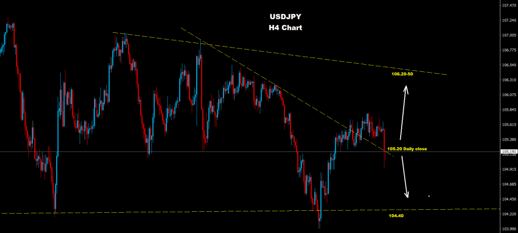 أي إغلاق يومي تحت مستويات 105.20 قد تدفع بتزايد ضغوط الهبوط والتراجع على السوق مع حواجز دعم على مناطق 104.40