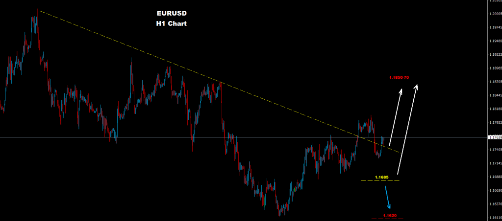 تحت مستويات 1.1685 فإن فرص مزيد من التراجع والهبوط قد تضرب السوق لإعادة اختبار حواجز دعم 1.1620