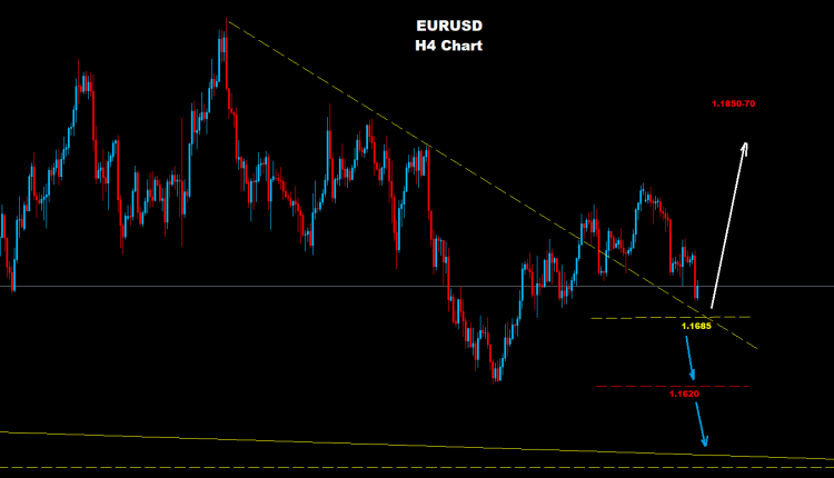 تحت مستويات 1.1685 فإن مزيد من التراجع لإعادة اختبار مناطق 1.1620 سيكون متوقع، في حين وتحت مستويات 1.1620 فإن مزيد من التراجع لمناطق 50-1.1520 قد تضرب السوق