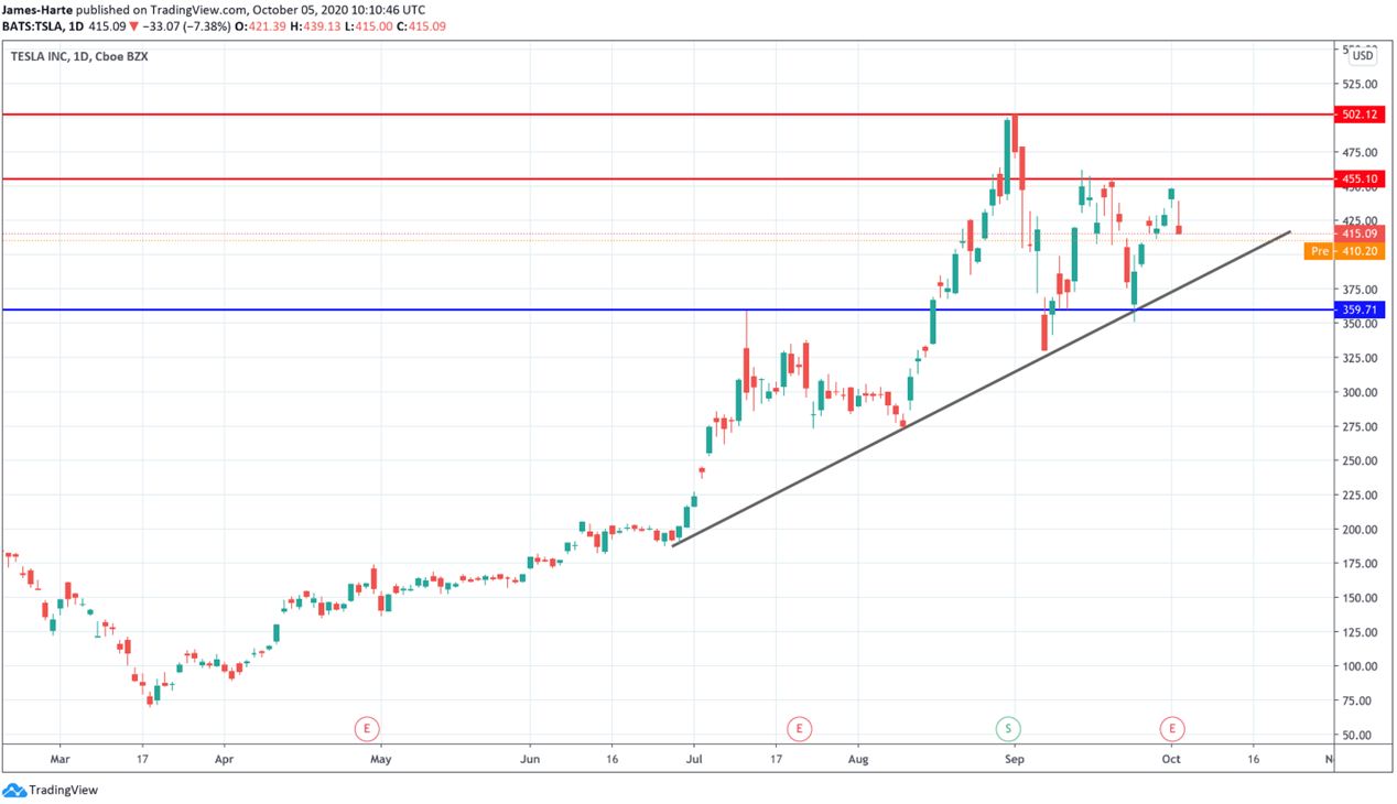 يتم تداول أسهم شركة الطاقة البديلة الأمريكية “تسلا” على انخفاض بنحو ٤٪ قبل افتتاح جلسة سوق يوم الاثنين، مما يزيد من الخسائر التي شهدتها أواخر الأسبوع الماضي. وهذا على الرغم من أن الشركة قد أبلغت عن ربع آخر من النتائج الإيجابية. إن خلفية المخاوف المتزايدة بشأن الموجة الثانية المحتملة من الوباء تفرض ضغوطاً سلبية أوسع على الرغبة في المخاطرة. ويعكس هذا الانخفاض في سعر سهم “تسلا”.