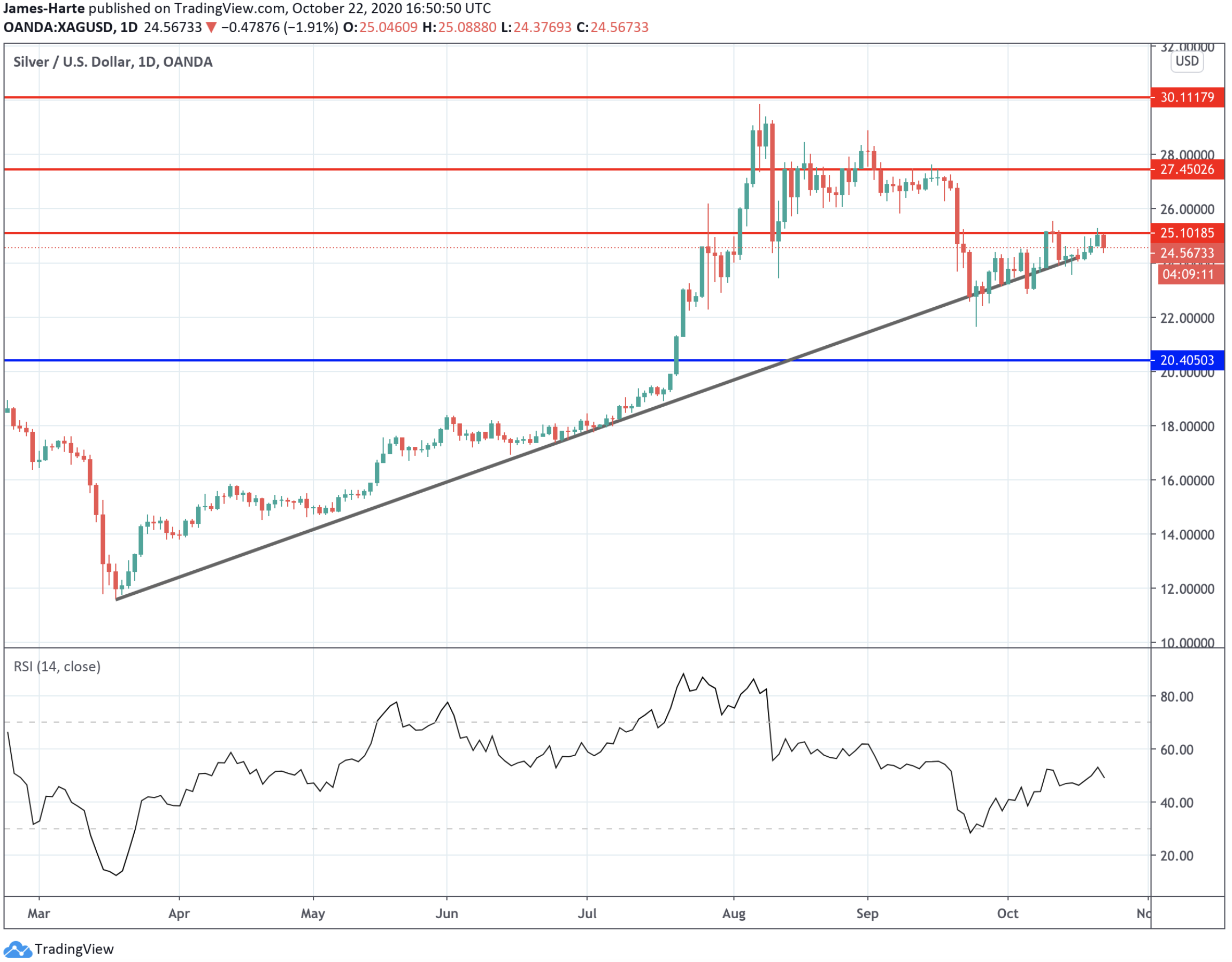 تواصل أسعار الفضة التشبث بخط الاتجاه الصاعد من أدنى مستوياته خلال العام، والذي لا يزال يمثل دعم في الوقت الحالي. ولكن كذلك لا يزال المستوى ٢٥.١٠١٨ صامداً كمقاومة وما لم يتمكن المضاربون على الارتفاع من تحقيق الاختراق مرة أخرى هنا قريباً، فإن الهبوط إلى المستوى ٢٠.٤٠٥٠ لا يزال يمثل خطر قائم على الفضة.