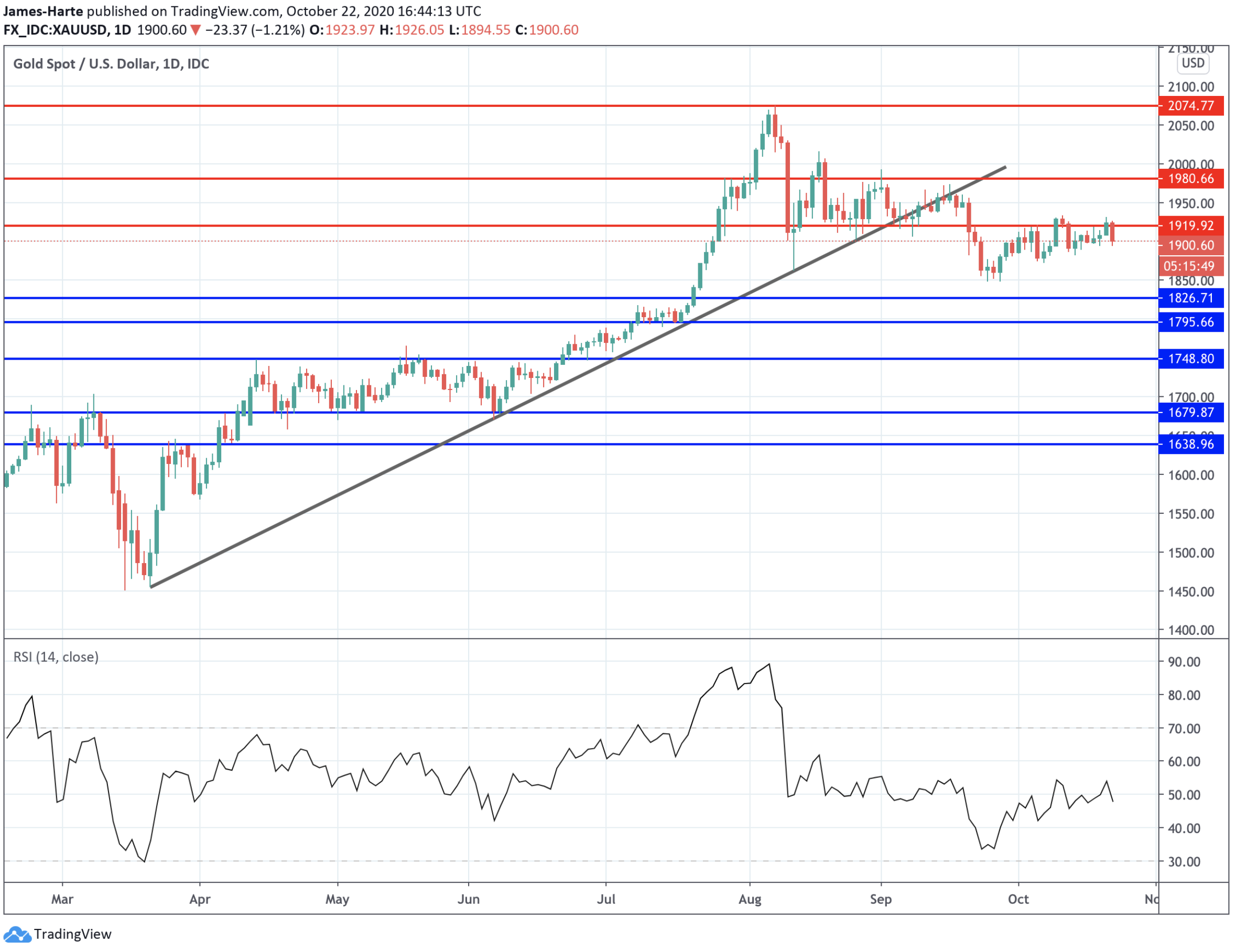 وكان المحرك الرئيسي لأسعار الذهب هذا الأسبوع هو الحركة الحاصلة في الدولار الأمريكي. وتعرضت العملة الأمريكية لضغط قوي خلال معظم هذا الأسبوع حيث أثرت حالة عدم اليقين قبل الانتخابات الأمريكية عليه، بالإضافة إلى الآمال في حزمة تحفيز جديدة، على المعنويات.