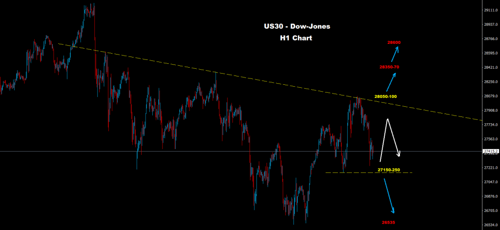 كما أشرنا له يوم أمس فإن مؤشر الداو نجح بالحفاظ على تداولاته تحت حواجز مقاومة 100-28050 حيث تمكن اليوم من ضرب أهداف مستويات 27300