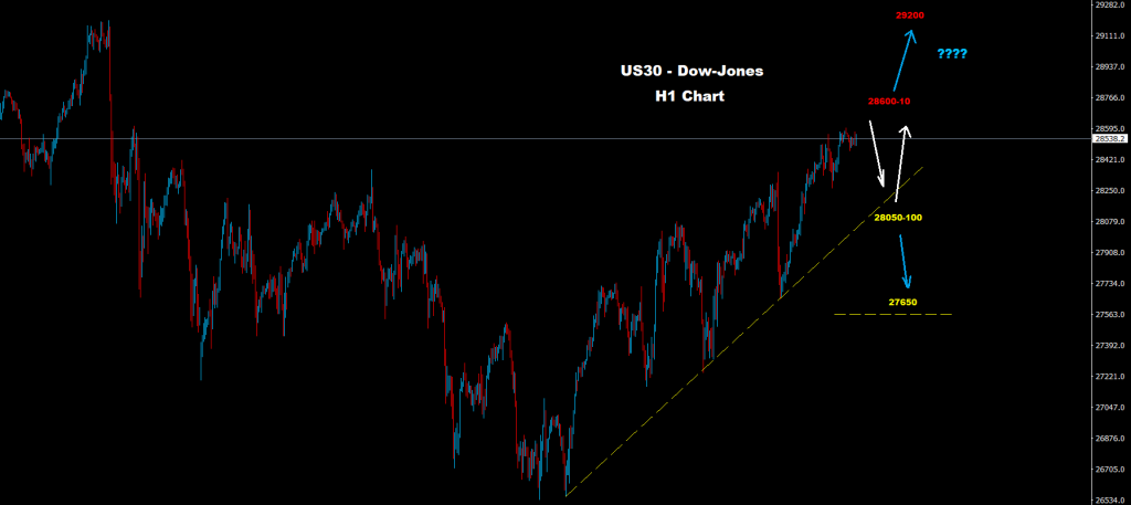 فوق مناطق 28610 فإن فرص مزيد من الارتفاع قد تضرب السوق نحو مستويات 28800 او 29200 و لكن بحذر