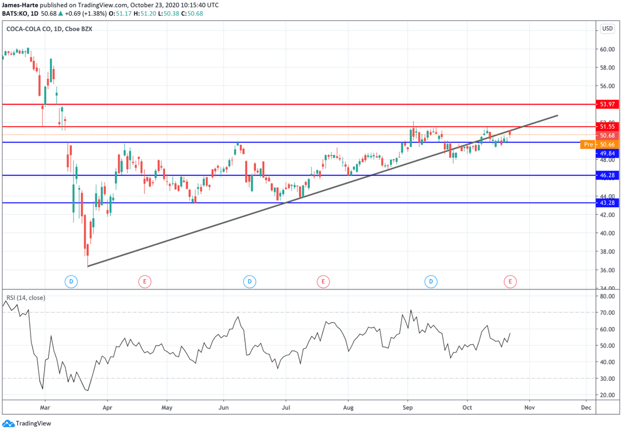 تصارع الأسهم في “كوكا كولا” الآن من جديد للارتداد فوق خط الاتجاه الصاعد المخترق مع وجود مستوى المقاومة الرئيسي ٥١.٥٥ المتواجد أعلاه مباشرة أيضاً. وإذا تمكن السعر من الاختراق هنا، فهناك ارتفاع واضح إلى المقاومة التالية عند المستوى ٥٣.٩٧. وعلى الجانب الهابط، يقع الدعم المحلي الرئيسي عند ٤٩.٨٤ مع وجود الدعم ٤٦.٢٨ أدناه مباشرة.