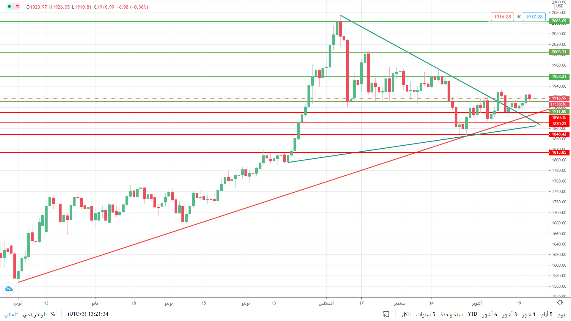 لكن حالياً يستمر بتداولاته اليومية أعلى مستوى المقاومة عند 1913 دولاراً للأونصة، والذي يعزز من فرص استهداف مستوى المقاومة الثانية عند 1956 دولاراً للأونصة قرب 21 سبتمبر تقريباً.